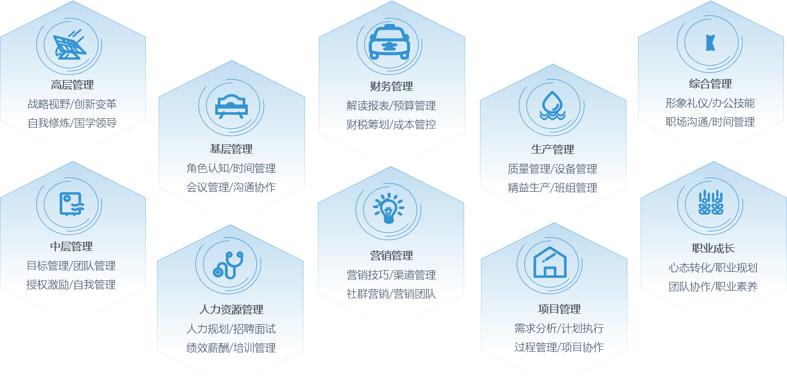 不同級別的員工發展方向各不相同且各有側重,沛邦學院的企業內訓從個人能力提升、崗位管理能力提升、管理技能提升、戰略能力提升、格局視野提升五個層面,精選國內外高端課程資源(100門課程涵蓋10大崗位領域),力求滿足不同發展階段的能力提升需求,幫助企業解決工作中的實際挑戰。
